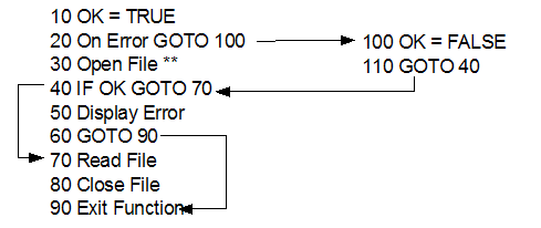 ** Probable source of error, such as file missing, though actually an On Error Goto will be in force throughout the entire function. But that's not important for demonstrating the concept of introducing structure to an unstructured language. Functional Decomposition